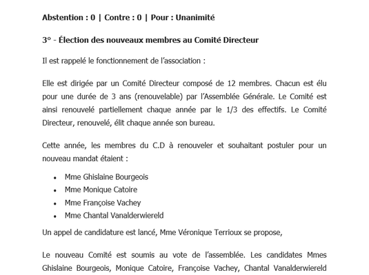 Art 8 : L'Association est dirigée par un Conseil de 12 membres élus pour 3 ans reconductibles. Ils ne peuvent pas être rétribués pour l'exercice de leurs fonctions électives.
